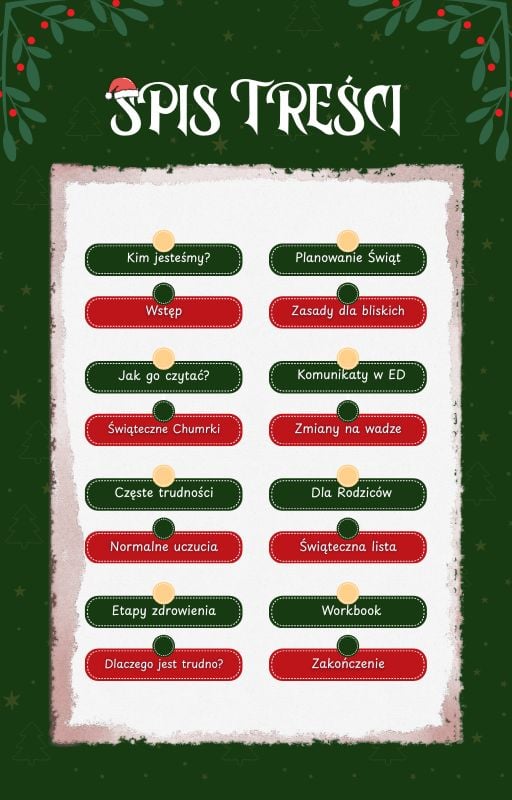 w jaki sposób zaplanować Święta na różnych etapach zdrowienia oraz zmagając się z różnymi trudnościami (restrykcyjne jedzenie, napady jedzenia, prowokowanie wymiotów, przymus intensywnych ćwiczeń fizycznych),